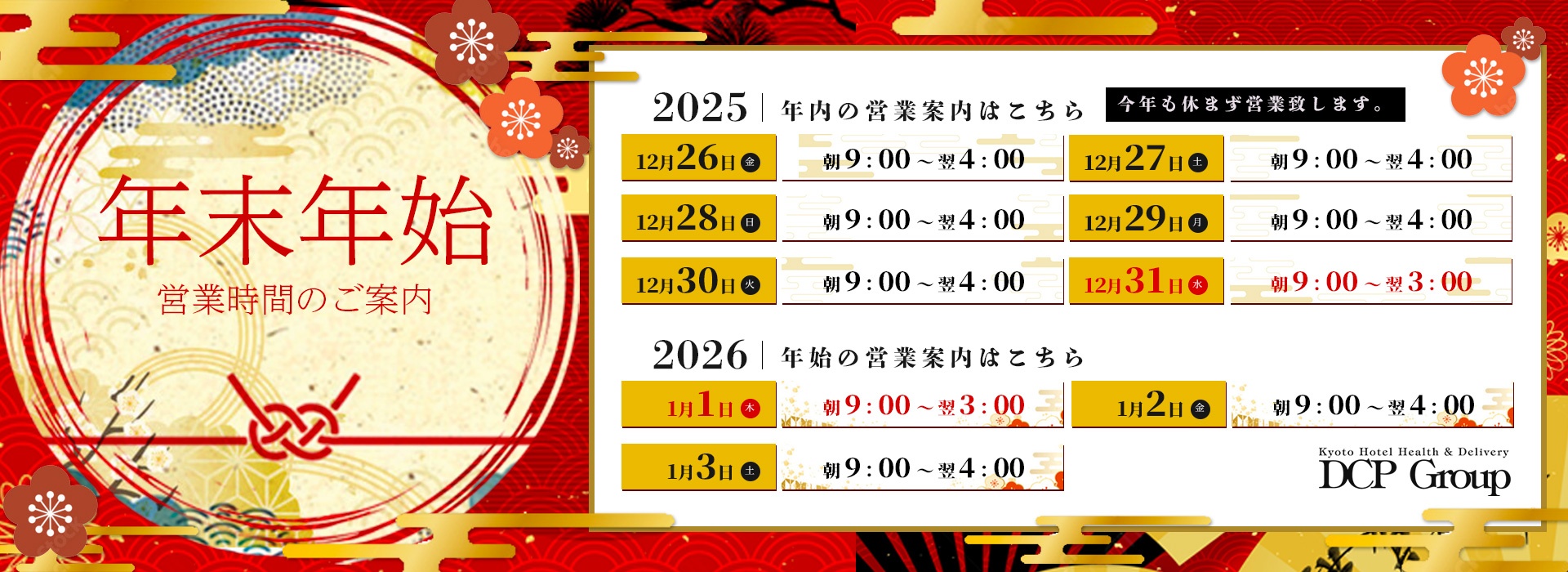 年末年始期間の特別営業に伴い、全コース料金を一律2,000円加算させていただきます。